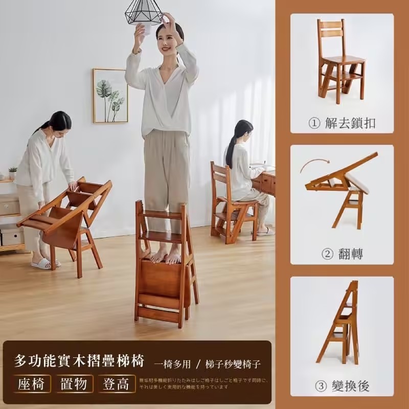2分鐘前【現貨】二合一折疊梯子椅,木料製作,打磨精緻,可變為簡易小梯子,可幫助拿取高處物品 - 【三層|純實木|翻转收纳】NT$2580